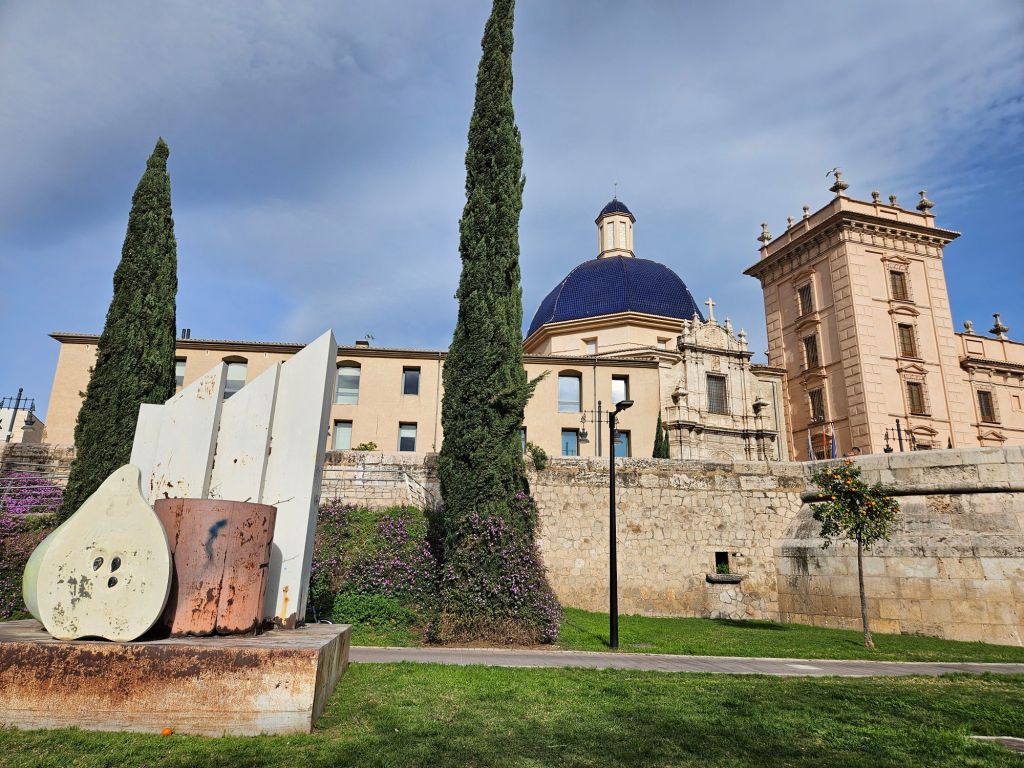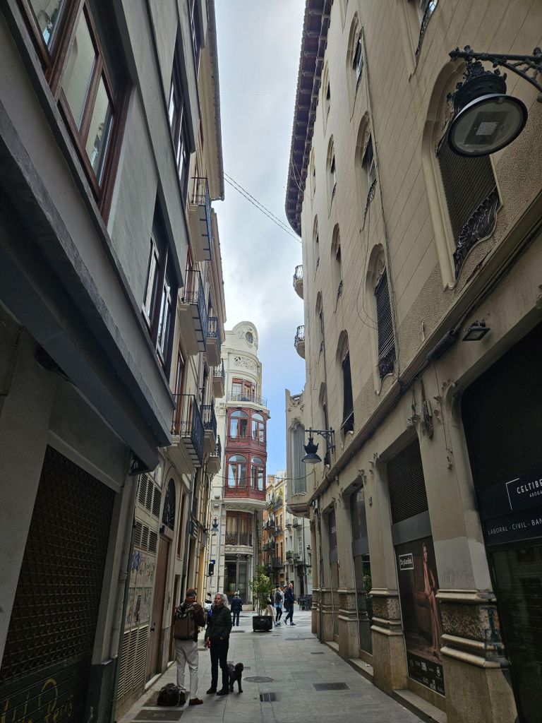 Walked up to the school building (about 10 minutes from where we’re staying) so we can find it tomorrow when we have to be there early. Then began meandering aimlessly, drifting down alleys, crossing big boulevards, and eventually eating lunch in a small cafeteria. Not brilliant, not terrible, just plain “milanese” (fried fish / cutlets) served with friendly smiles and patience with our faulty Spanish. Made less serviceable because our waiter spoke Valenciano – “yo soy” sounds something like “shgo jhoy.”