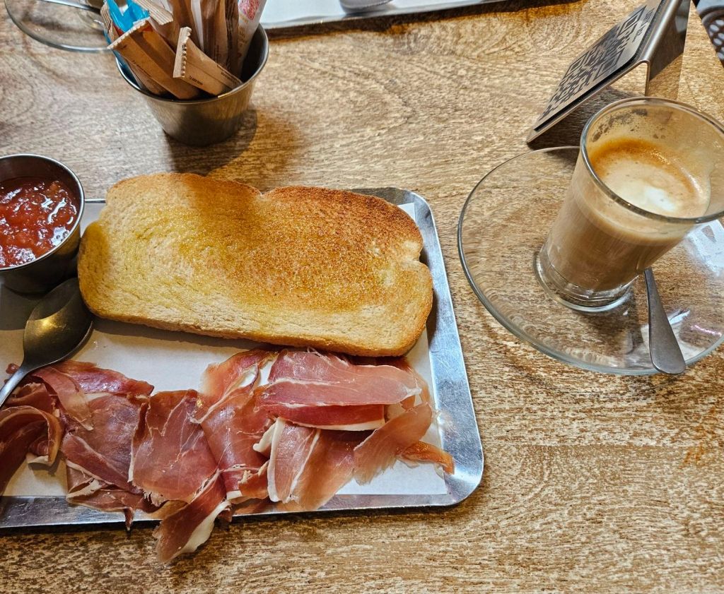 We crawled out of bed quite late (not used to shutting down bars on Saturday nights!) and made our way outside. Since we’re here for 3 weeks, and spending the first 2 of those in language classes, we decided today would be a non-tourism day to rest and recharge. Started with a traditional Spanish breakfast of tomato, ham, toast and cortado, the top local coffee choice served in a glass.
