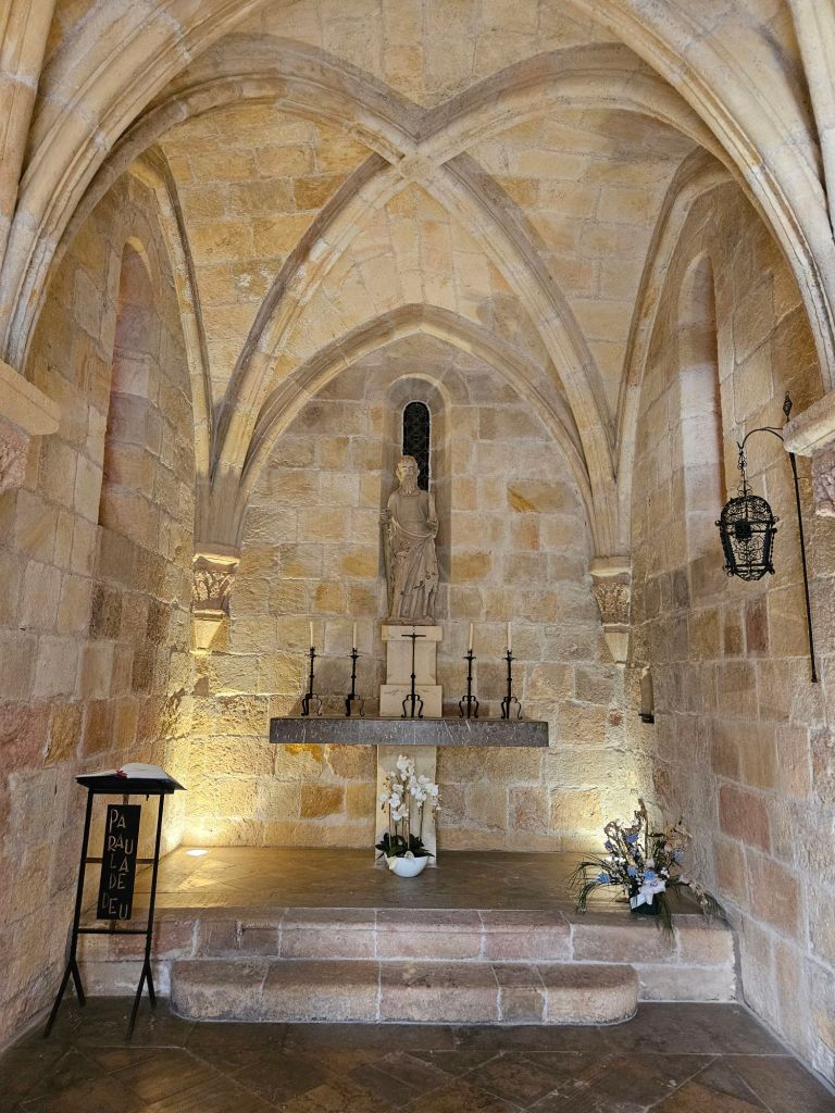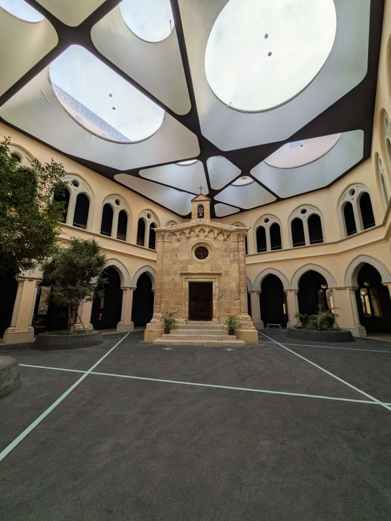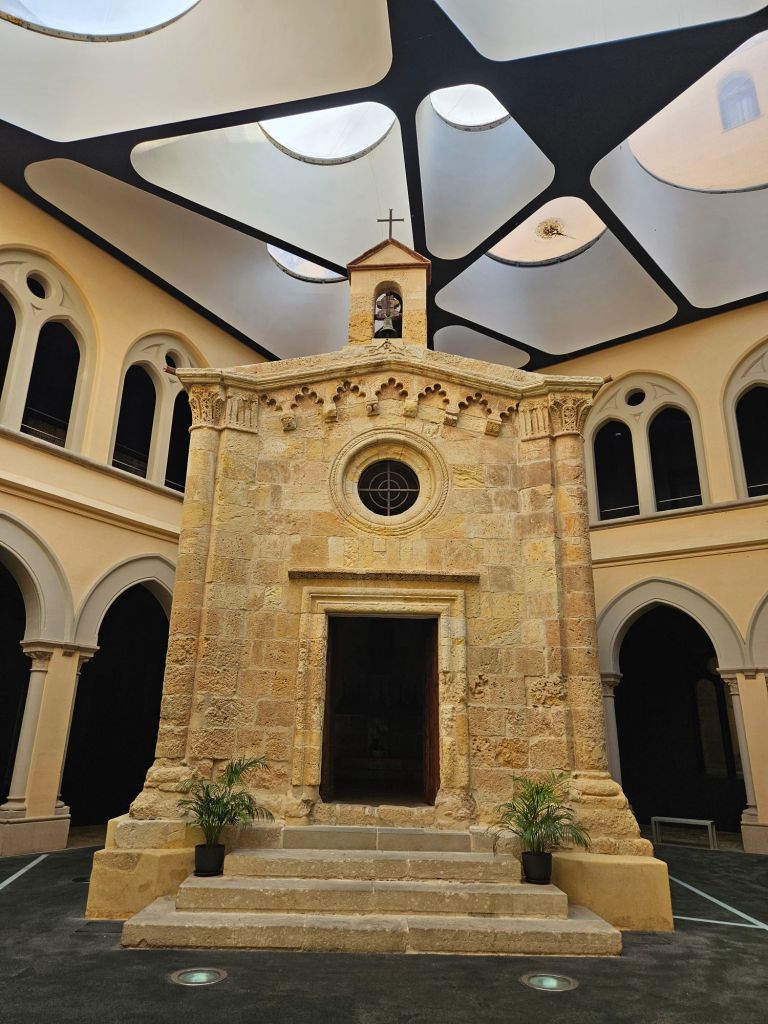 The chapel dates from the 13th century, after the end of the Muslim era, and was built as a satellite to the main cathedral (that’s another post). It adjoined the medieval hospital. Not only were two versions of the C. 18 building built around it, but in 2012 the whole courtyard was enclosed in ultra-modern style. The combination is like nothing we’ve ever seen.