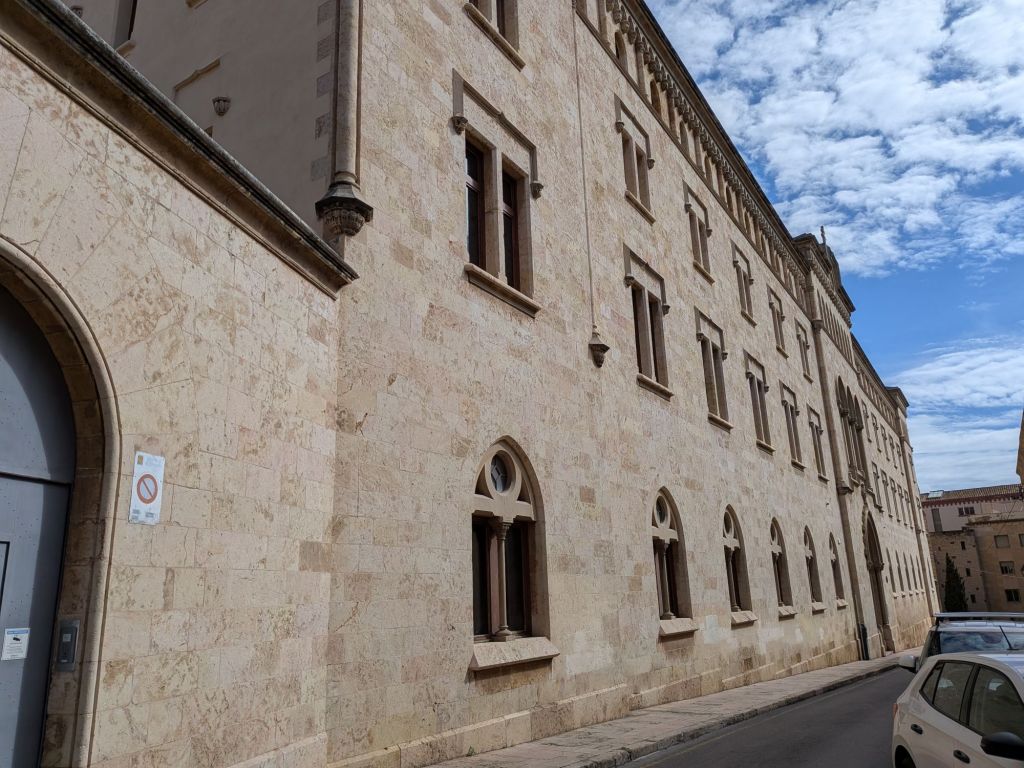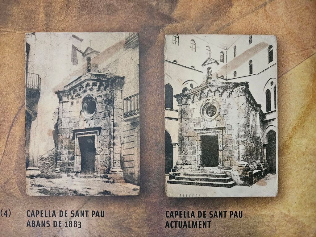 So that stop was fast. Up the street to the Chapel of St. Pau (Paul). We’re expecting a small 13th century chapel, but find a huge imposing building instead. Turns out it is the former seminary, built in the 1880s around the chapel, in a mix of Gothic and Renaissance styles that manage to be imposing and wonderfully elegant. (Hard to capture though because the surrounding streets are so narrow.)